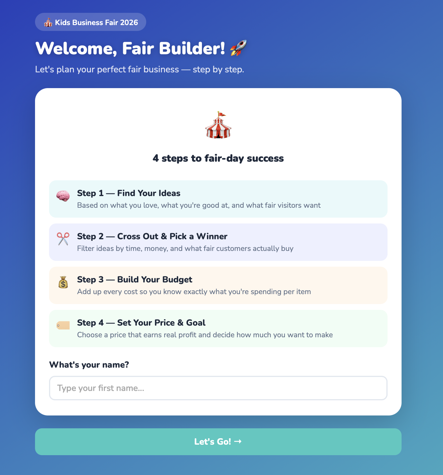 Check our our Fair Builder game! If you were a shop at the Kids Business Fair, what product should you choose, and how much should you sell it for? Play the game to find out! (It’s free and you don’t need to give any information.)